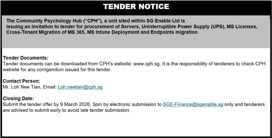 The Community Psychology Hub (“CPH”), a unit sited within SG Enable Ltd is issuing an invitation to tender for servers, uninterruptible power supply (UPS), Microsoft licenses, cross-tenant migration of Microsoft office 365, Microsoft Intune deployment and endpoints migration.